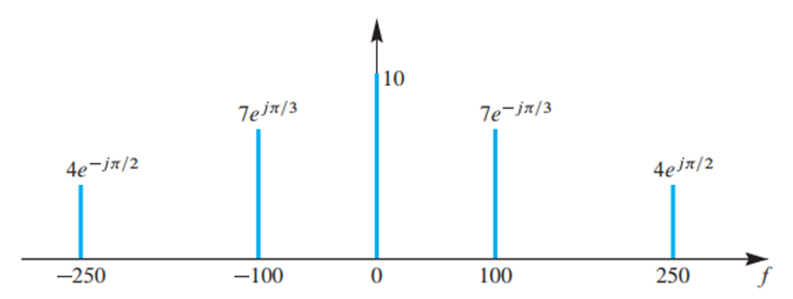 $$x(t) = 10+7e^{-j\pi/3}e^{j2\pi(100)t}+7e^{j\pi/3}e^{-j2\pi(100)t}+4e^{j\pi/2}e^{j2\pi(250)t}+4e^{-j\pi/2}e^{-j2\pi(250)t} …(1)$$