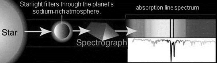 이는 흰색 빛의 스펙트럼이 행성의 대기를 통해 전달되는 방식을 보여주는 아래 그림에서 설명될 수 있다.