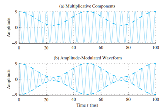 ** 그림 설명 : fc = 200 Hz 및 f = 20 Hz에 대한 AM 신호이다. (a) 상단 점선으로 표시된 신호 5 + 4 cos(40πt)와 시각적 편의를 위해 9배 확장된 스케일로 표시된 200 Hz 사인파 cos(400πt) (상단 그림의 실선)이 있다. (b) (a)의 두 신호의 곱으로 형성된 AM 신호(하단 실선)는 200 Hz에서 진동하지만 진폭 변화가 있다. 이러한 변화를 엔벨롭이라고 한다 (하단 점선).