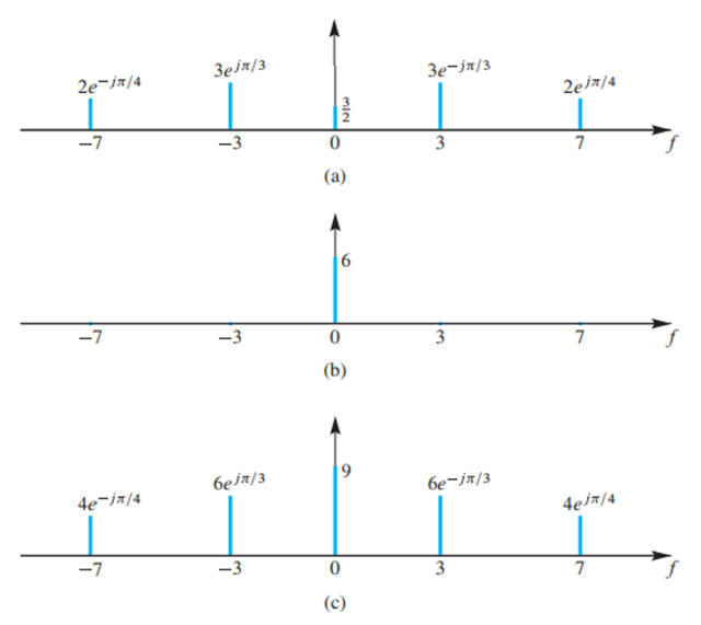 y(t) = 2x(t) + 6이고, x(t) = 3/2 + 6 cos(6πt − π/3) + 4 cos(14πt + π/4) 일 때, x(t)의 스팩트럼은 아래 그림의 (a)와 같다. 그리고 y(t)는 (c)와 같다. f = ±3와 ±7에서의 복소진폭은 그림 (a)에서 보이는 것처럼 대칭을 이룬다. 그림 (c)는 그림 (a)에서 주파수 성분이 있는 항에 곱하기 2를 해준 것이다. 그림(b)는 DC성분 6만 플로팅 한 그래프이다. 그림(c)에서의 DC값은 2(1.5)+6 = 9이다.