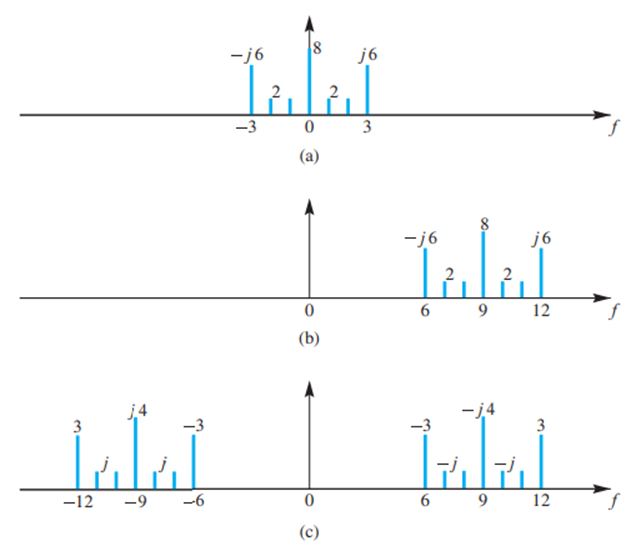 스펙트럼의 이 주파수 이동 행동을 그래프로 표현하는 것은 간단하다. 아래 그림의 (b)는 fc = 9, A = 1 및 ϕ = 0인 복소 지수함수로 곱해진 신호의 스펙트럼을 보여준다. (a)의 x(t)의 스펙트럼은 일곱 개의 스펙트럼 라인을 가지며, 켤레 대칭이기 때문에 x(t)는실수이다. $$x(t)ej^{2π(9)t}$$의 신호는 동일한 일곱 개의 스펙트럼 라인으로 구성된 스펙트럼을 가지지만, 주파수가 f = 9 Hz를 중심으로 이동되었다. 이 신호는 이제 실수가 아니며, 그 스펙트럼은 켤레 대칭 속성을 따르지 않는다.