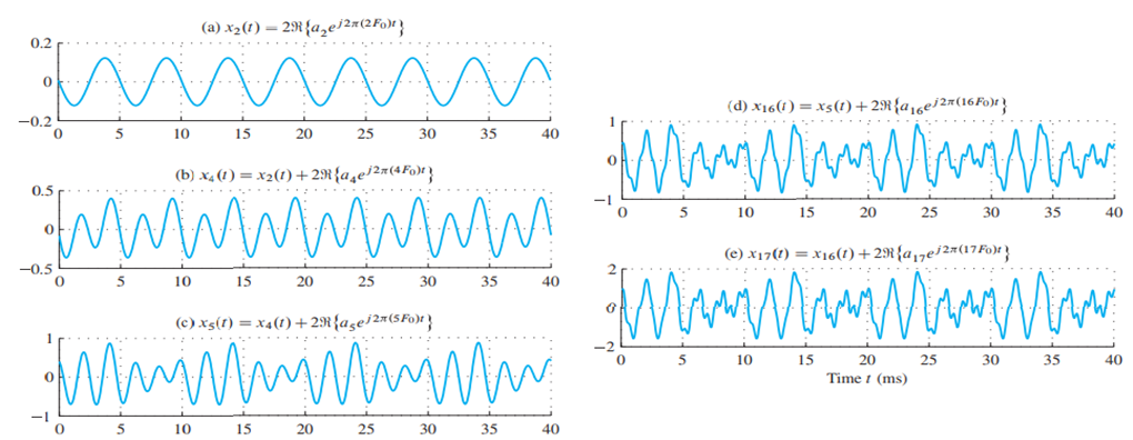 x17(t)의 주기는 F0와 동일한 10 ms인 T0이다. 이는 F0 주파수를 가진 구성 요소가 없더라도 해당된다. 신호 x17(t)는 말소리에서 모음 소리의 파형과 유사하지만, 자연스러운 말소리 신호의 파형을 정확하게 나타내기 위해서는 더 많은 주파수가 필요할 수 있다. 신호의 고주파 성분은 파형의 세부적인 모습에 기여한다. 이는 위 그림에서 확인할 수 있으며, 16번째와 17번째 고조파와 같은 더 높은 주파수 구성 요소가 추가됨에 따라 파형이 점점 복잡해지고 더 빠르게 변한다.