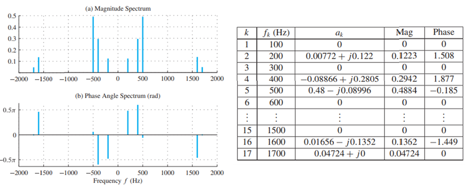 합성 주기 신호중 하나의 예를 들어보자. 이 신호는 기본 주파수가 F0로 100Hz이며 0이 아닌 선분인 {a±2, a±4, a±5, a±16, a±17}. 을 포함하고 있다. 복소 지수 함수의 계수는 아래 표와 같이 나타내겠다. 신호의 스팩트럼도 아래 그림에 명시해 두었다. (a)는 크기에 대한 그래프이고 (b)는 위상에 대한 그래프이다.