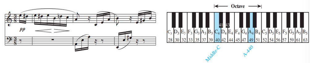 피아노의 검은 건반은 추가 표기가 필요하며, 이는 "샵" (♯) 또는 "플랫" (♭)을 사용하여 수행된다. 왼쪽 그림에는 몇 개의 음표 옆에 샾이 붙어있다. (예를 들어, D#5.) 악보는 높은 음 부분(상단 다섯 줄)과 낮은음 부분(하단 다섯 줄)으로 나뉘며, 음표의 중앙 참조점은 "미들 C"에 있다. 이는 높은음과 낮은음 사이에 있다 (오른쪽 그림의 40번 키). 따라서 높은 음 부분의 가장 아래 음반은 미들 C보다 두 개 위에 있는 흰색 건반이며, 이는 그림 (1)의 44번 키와 해당된다.