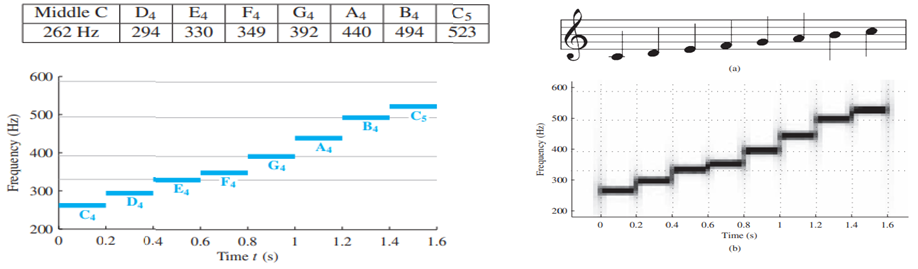 신호의 주파수 차원에서의 내용은 분석(analysis) 또는 합성(synthesis) 두 가지 관점에서 고려될 수 있다. 예를 들어, 위 그림 (2) 에서의 이상적인 시간-주파수 다이어그램은 C 장조 음계를 합성하는 규칙을 보여준다. 분석은 더 어려운 문제이다. 우리가 배운 Fourier 시리즈 분석 적분법이 그 예이다. 시간에 따라 변화하는 주파수의 분석은 대부분의 신호 처리 과목에서 연구 및 응용의 중요한 주제이다. 이것은 고급 대학원 과정에 이르기까지 해당된다. 이유는 Fourier 시리즈 적분과 같은 수학적 공식을 작성하는 여러 가지 방법이 있기 때문이다. 반면에, 시간-주파수 스펙트럼 분석을 위한 우수한 수치 루틴은 이미 잘 구현되어 있다. 스펙트로그램을 계산하는 것은 쉽다. 스펙트로그램은 신호의 스펙트럼 내용의 시간 변화를 측정한 것으로, 시간과 주파수의 두 가지 차원 함수이다.
