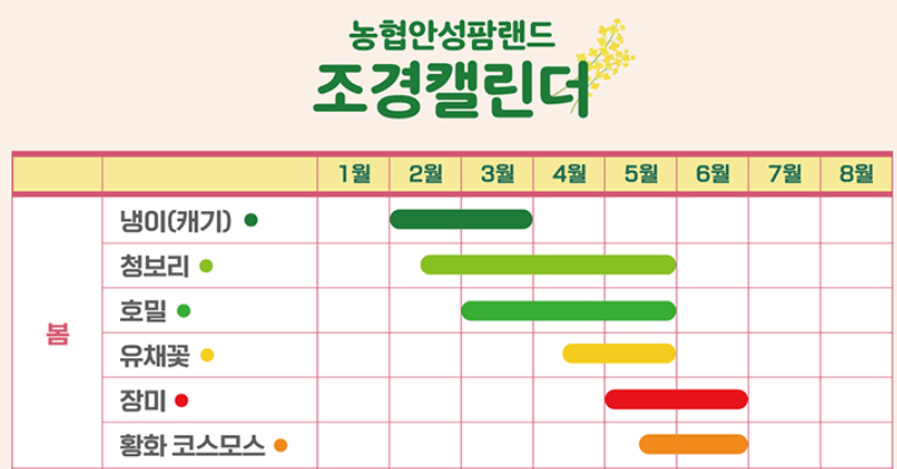 벚꽃이 지면 유채꽃이 매우 아름답게 핍니다. 미니 놀이기구들도 많아 미취학아동들과 함께 가기 좋은 장소입니다. 아래 그림을 보시면 달마다 어떤 조경을 즐길 수 있는지 보실 수 있습니다.