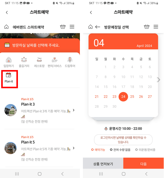 에버랜드 어플 첫화면 – 스마트 예약 – 에버랜드 – Plan-it 을 클릭하시고 원하는 옵션을 선택하세요. 선착순입니다. 당일 구매는 불가능 하며 일주일치씩 날짜가 열립니다.