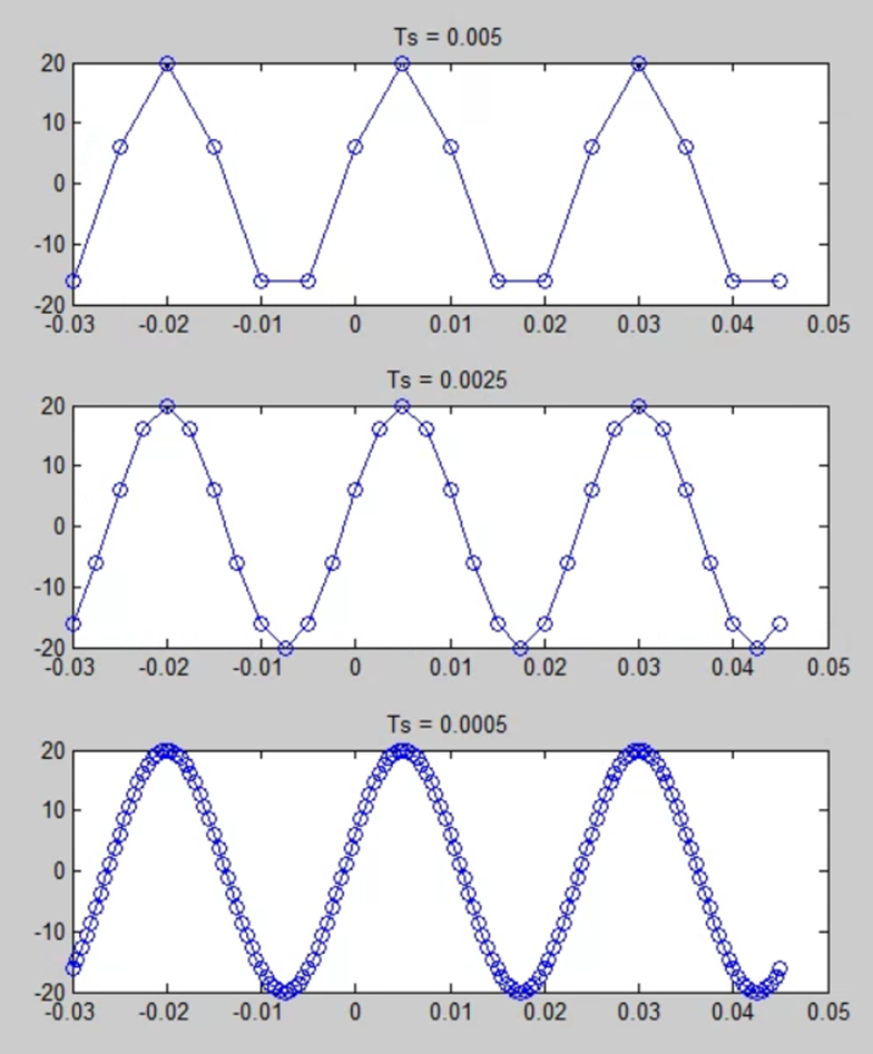 위 코드에서는 샘플링 주기를 0.005s로 설정했다. 결과물은 아래 그림의 가장 윗 그림과 같다. 방금 위에서 설명했듯 샘플링 주기를 더 짧게 잡으면 아래 그림과 같이 더 촘촘한 신호를 얻을 수 있다.